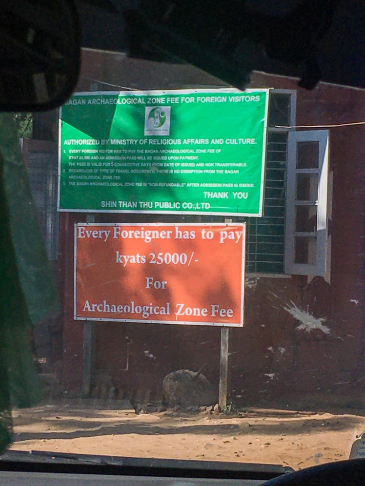 The Bagan Archaeological Zone Fee is a mandatory fee required by all foreigners visiting Bagan. It costs 25,000 kyat (roughly $19 USD) and is valid for 5 days. Upon entering Bagan, your taxi will be stopped and you will be required to pay it.
